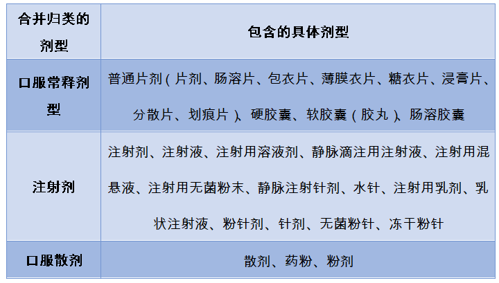 此外,同品种药品的限定还要考虑医保制剂的界定,本次“4+7”目录涉及的医保规格是口服常释剂型、散剂和注射剂,根据2017年版医保目录西药剂型在《中国药典》“制剂通则”的基础上合并归类处理,这两个剂型涉及到剂型包括: