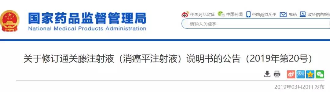3月20日,国家药监局发布《关于修订通关藤注射液(消癌平注射液)说明书的公告(2019年第20号)》。