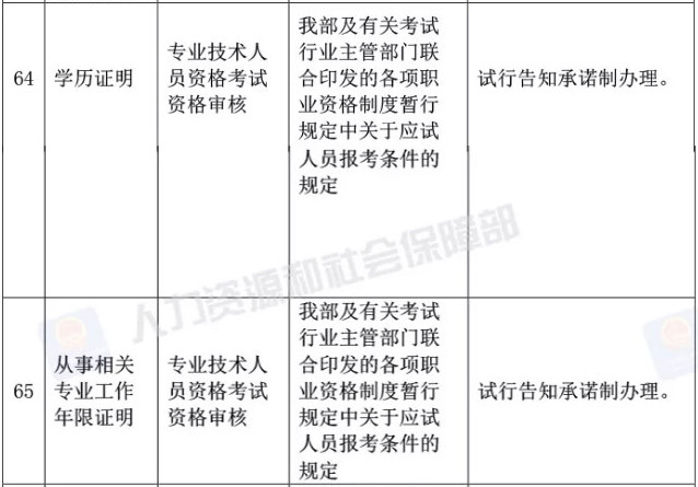 在《取消的规范性文件设定的证明材料目录》中,包括取消专业技术人员资格考试资格审核时需提供的学历证明和从事相关专业工作年限证明,取消后的办理方式将试行告知承诺制。