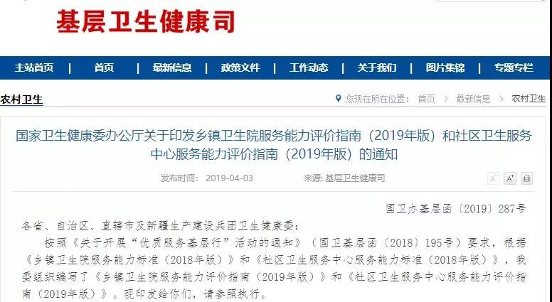 医药网4月4日讯 4月3日,国家卫健委官网发布《国家卫生健康委办公厅关于印发乡镇卫生院服务能力评价指南(2019年版)和社区卫生服务中心服务能力评价指南(2019年版)的通知》,从功能任务和资源配置、基本医疗和公共卫生服务、业务管理和综合管理等方面,细化说明可操作性标准,推动基层医疗卫生机构对照整改和提升。