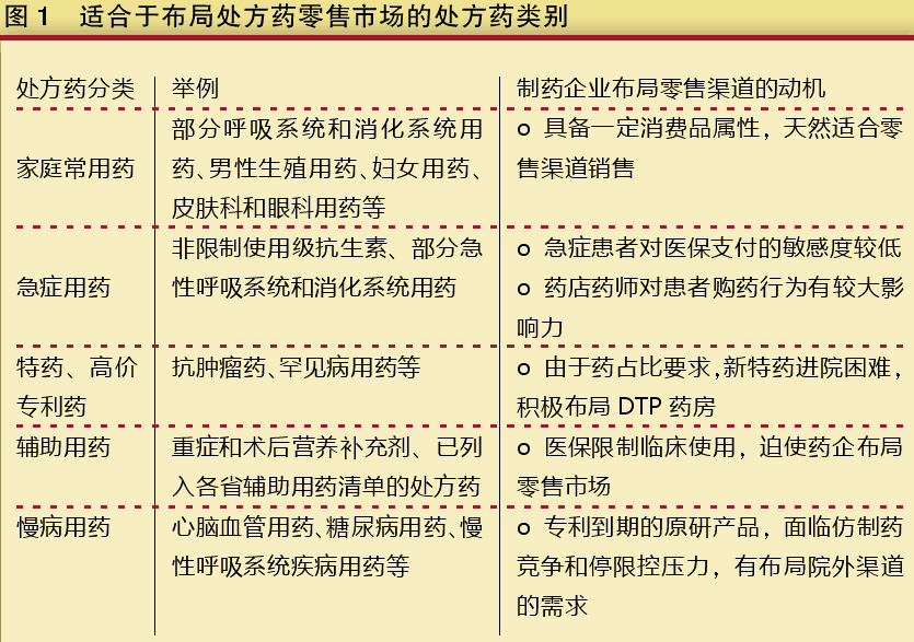 普华永道通过调研发现:不是所有类型的处方药都适合开发零售市场,且不同类型处方药的生产企业的需求也不一样(见表1)。其中,有几类药品适合于零售渠道销售:①具备消费品属性的药品(比如一些呼吸系统用药、消化系统用药、男性生殖用药、妇女用药、皮肤科和眼科用药等家庭常用药);②对医保支付敏感度低的药品(如急症用药);③药店药师对患者购药行为较易产生影响力的药品;④医保限制使用的产品;⑤因“药占比”要求进院困难的产品;⑥专利到期的原研产品等。