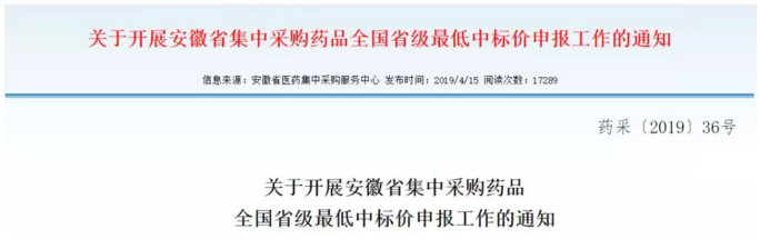 4月15日,安徽省医药集中采购平台发布通知称,为完善安徽省药品集中采购系统数据库、规范药品集中采购工作,经报省医保局同意,现开展我省集中采购药品全国省级最低中标价的申报工作。
