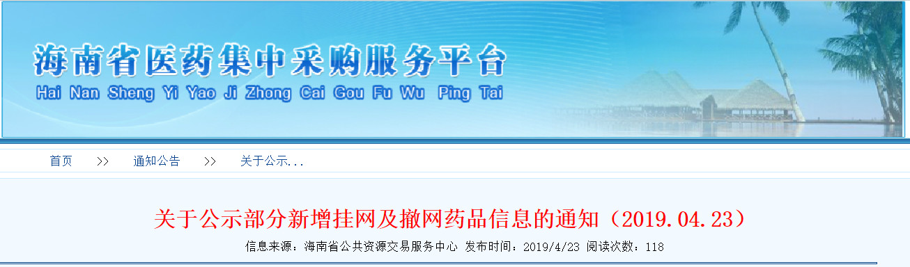 4月23日下午,海南省公共资源交易服务中心发布《关于公示部分新增挂网及撤网药品信息的通知》(以下简称《通知》)。