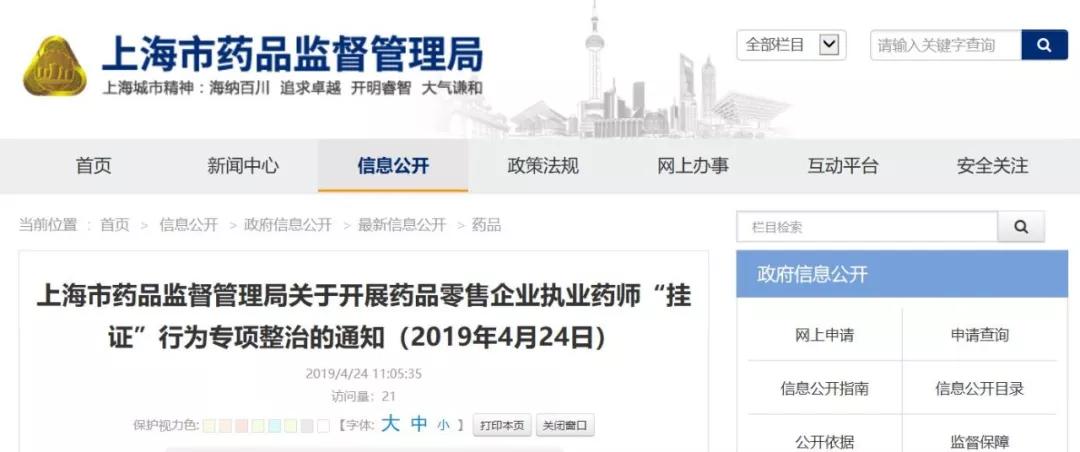 医药网4月25日讯 4月24日,上海市药品监督管理局官网发布《上海市药品监督管理局关于开展药品零售企业执业药师“挂证”行为专项整治的通知(2019年4月24日)》(简称《通知》),决定于2019年4月~9月期间在全市范围内开展药品零售企业执业药师“挂证”行为专项整治,对药学专业人员流动频繁、配备不到位,存在药师不在岗销售甲类OTC、处方药等违规行为和执业药师社保缴费与注册单位不一致的零售药店作为重点检查对象。