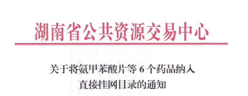 近日,湖南省公共资源交易中心发布《关于将氨甲苯酸片等6个药品纳入直接挂网目录的通知》,有6个药品被纳入直接挂网目录。