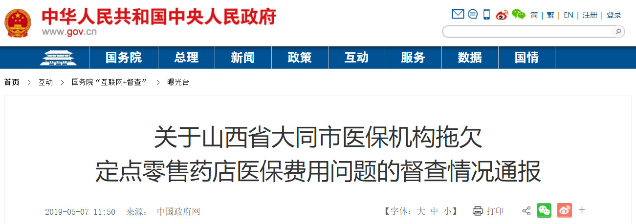 5月7日,中国政府网发布《关于山西省大同市医保机构拖欠定点零售药店医保费用问题的督查情况通报》(下称《通报》)。