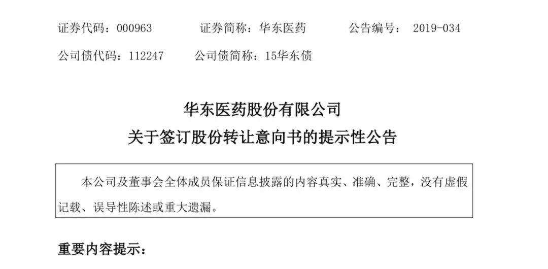 5月26日,华东医药发布《关于签订股份转让意向书的提示性公告》(以下简称《公告》)。