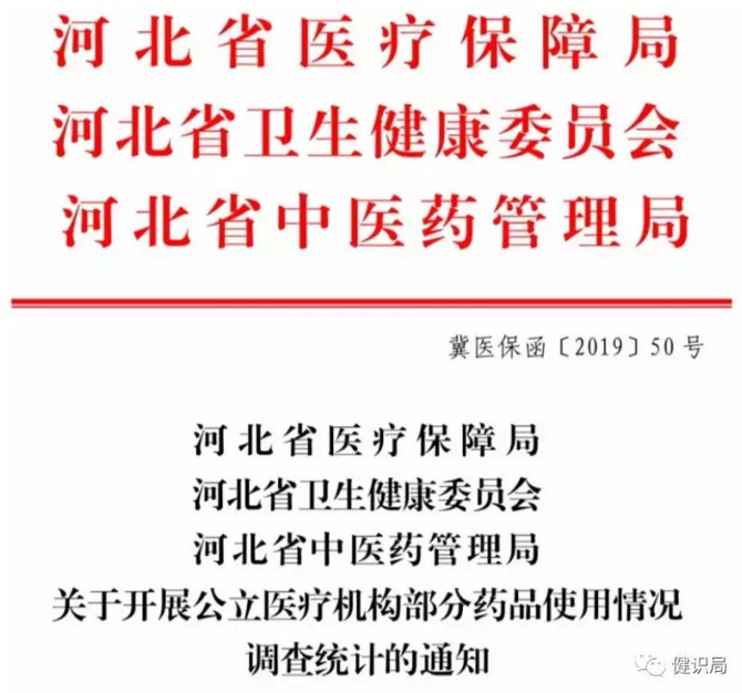 5月31日,河北省医保局、省卫健委、省中医药管理局联合发布通知称,为加快推进该省药品集中采购和使用工作,经研究,决定对全省公立医疗机构部分药品使用情况进行调查统计。