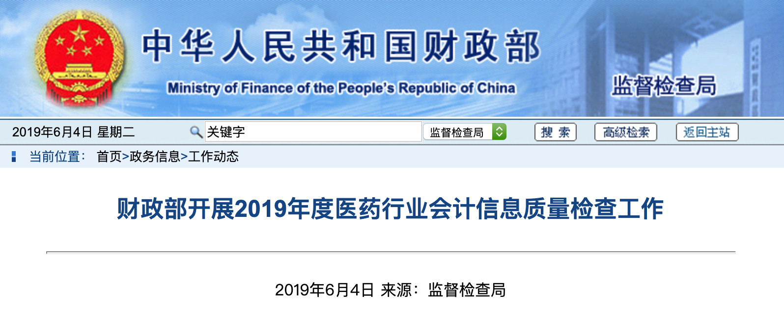 6月4日,财政部官网挂出通知,要组织部分监管局和各省、自治区、直辖市财政厅(局)于2019年6月至7月开展医药行业会计信息质量检查工作。