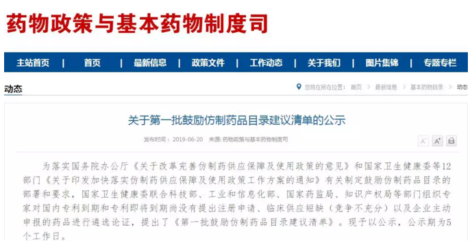 6月20日,卫健委官网挂出第一批鼓励仿制药品目录建议清单的公示,共34个品种,公示期为5个工作日。