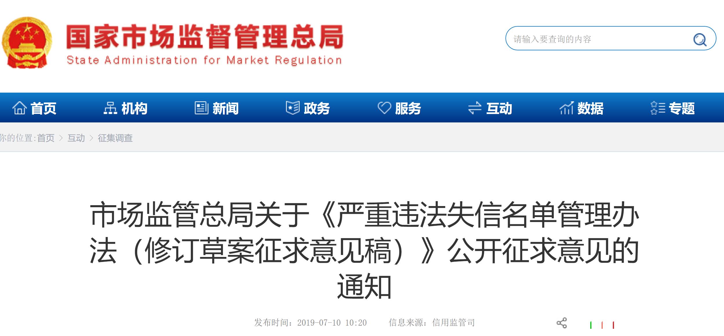 医药网7月11日讯 7月10日,国家市场监督管理总局官网就《严重违法失信名单管理办法(修订草案征求意见稿)》(以下简称《征求意见稿》)向社会公开征求意见。