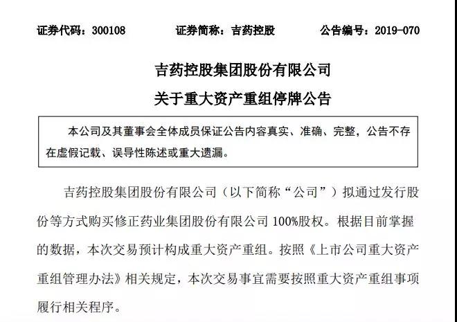 7月11日,吉药控股发布《关于重大资产重组停牌公告》,拟通过发行股份等方式购买修正药业集团股份有限公司(以下简称修正药业)100%股权。