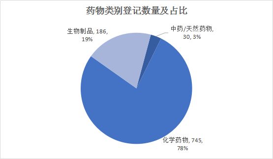 2019年上半年,CDE药物临床试验登记平台总共公示961个临床试验。其中,化学药物 745 个,生物制品 186 个,中药/天然药物 30个。