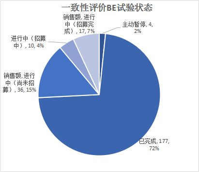 2019年上半年,仿制药一致性评价已登记的BE试验185个,比2018年同期下降24.18%。登记的BE试验主要格局如下:BE试验已经有177个完成了,同时还有15%尚未招募。