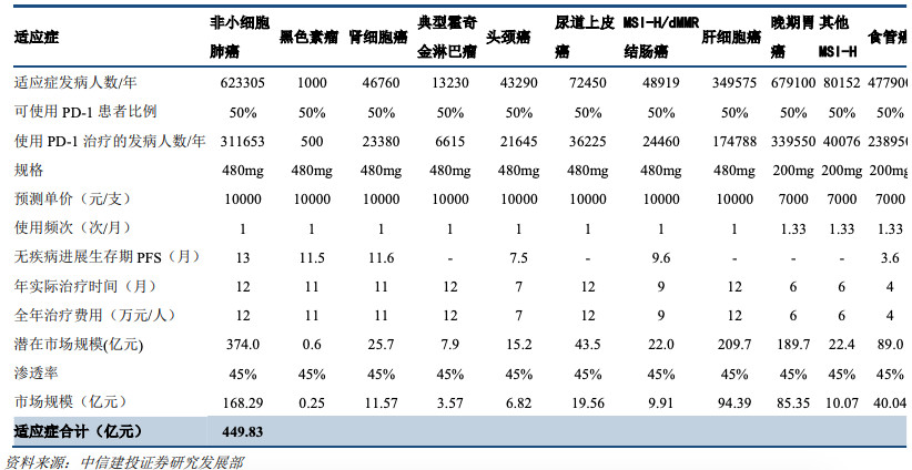 据中信建投预测,国产PD-1定价预计在10-12万/年。根据不同适应症的无疾病进展生存期进行市场规模预测,预计总体市场规模约为450亿元/年。可见,在我们国内创新药的市场前景是非常巨大的。