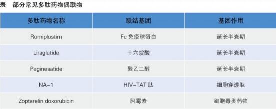 其中,共轭联结基团已成为改变多肽药物性质的重要手段。从2010年起,全球约有30%处在临床试验阶段的多肽药物是结合物,比如与聚乙二醇、脂质和蛋白质等结构偶联。研究证明,缀合Fc片段能延长多肽半衰期,多肽药物偶联物还能用作细胞毒性剂的有效载荷和传递物(部分常见多肽药物偶联物见表)。