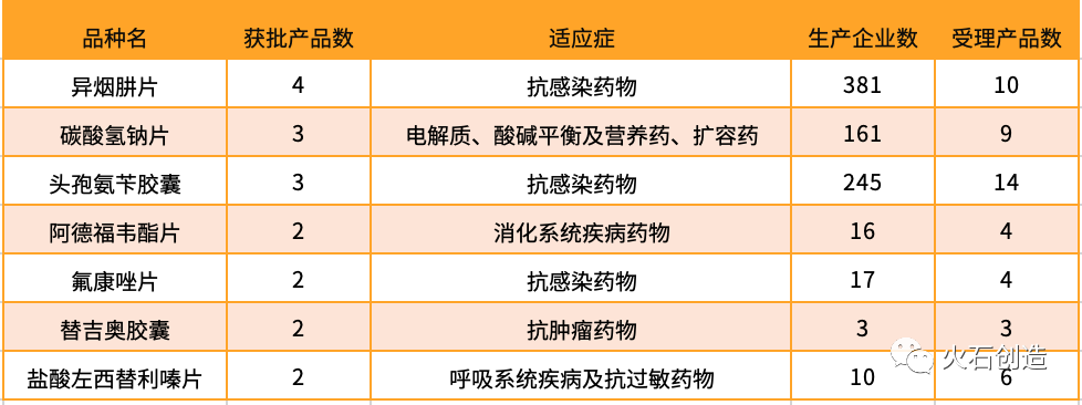 根据火石创造数据库,2019年H1新增过评品种数达42个,11个品种过评产品数超过1个,过评产品数最多的品种为抗感染类药物“异烟肼片”,生产企业包括宜昌人福药业、沈阳红旗制药、华中药业和广东华南药业共4家。