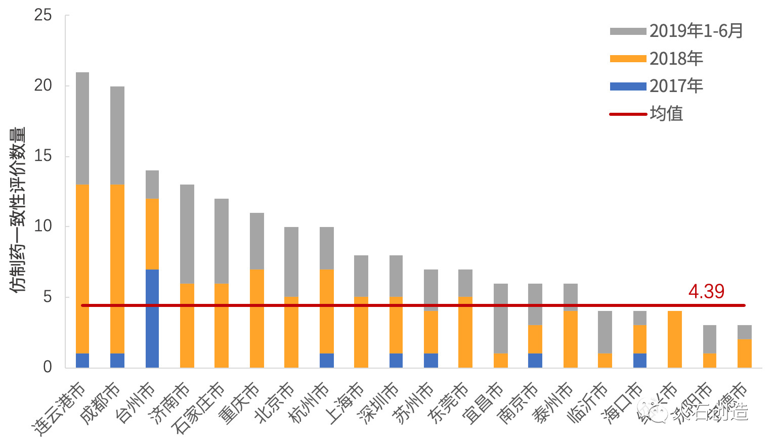 图4 2017—2019年H1全国仿制药一致性评价数大于2个的城市