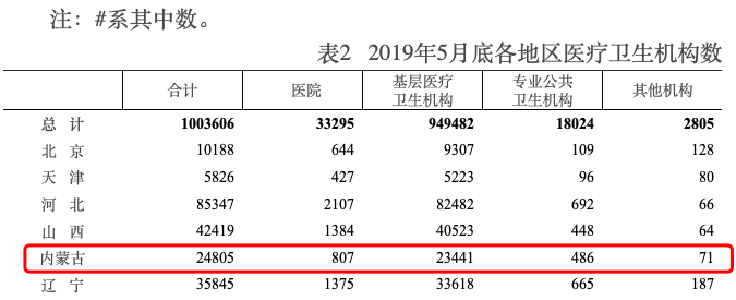 据赛柏蓝查询,国家卫健委统计信息中心数据显示,截至2019年5月底,内蒙古各类医疗机构合计有24805个,医院807家(包括公立医院和民营医院)。