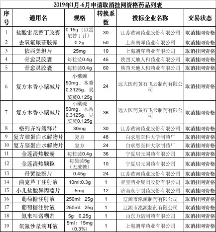 附:2019年1月-6月申请取消挂网资格药品列表