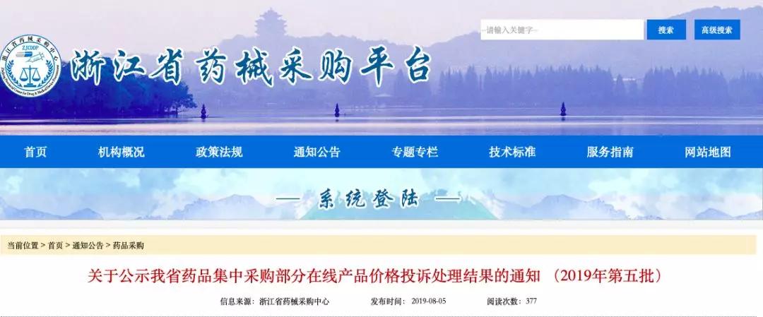 8月5日,浙江省药械采购中心发布《关于公示我省药品集中采购部分在线产品价格投诉处理结果的通知(2019年第五批)》(以下简称《通知》)。