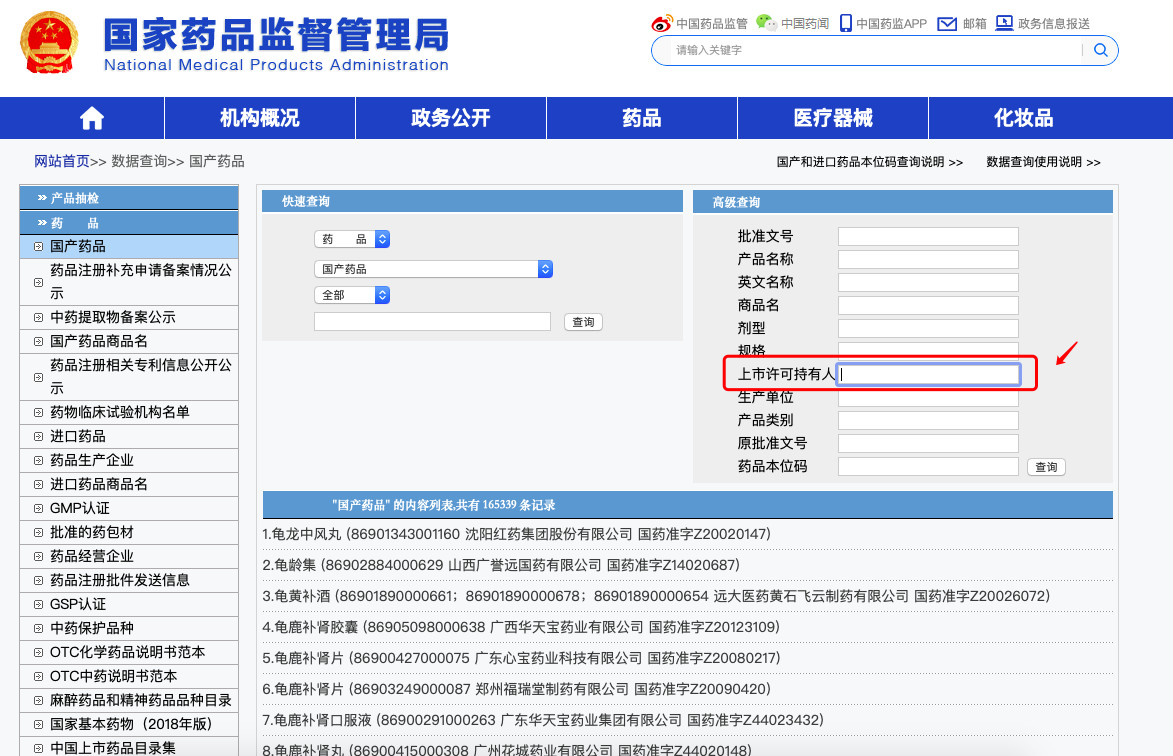 增加依权限的数据下载功能,为监管部门提供全面的数据服务,系统内用户可登录国家药品监管应用整合与数据共享平台进行查询(见图1、2),实现共建共享。同时将上市许可持有人品种信息推送至国家局药品批准文号数据库,实现与国家局政府网站联动。公众可通过国家局网站数据查询栏目进行检索(见图3),对外提供准确全面的持有人数据查询服务,实现信息公开,让企业、公众更具获得感。