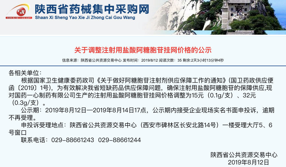 医药网8月13日讯 8月12日,陕西省药械集中采购网发布《关于调整注射用盐酸阿糖胞苷挂网价格的公示》。
