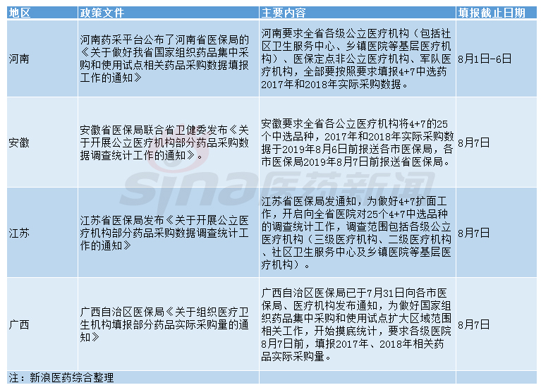 就在该份文件流出之际,有媒体曝出,广西、河南、安徽、江苏等正在组织全省/区填报国家组织药品集中采购和使用试点相关药品实际采购数据。