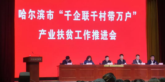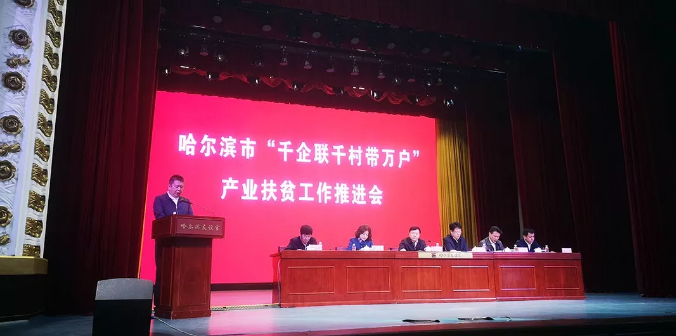 会议由市扶贫办党组书记董绍涛主持,市工商联主席徐伟首先宣读《哈尔滨市“千企联千村带万户”产业扶贫工作方案》。市委常委统战部部长梁野出席会议并讲话,他要求,全市各部门、各区县(市)要高度重视“精准扶贫”工作,把扶贫攻坚任务纳入到主要工作目标中,立足长远、精心谋化、精准施策、确保实效,坚决完成2020年哈市脱贫工作目标。
