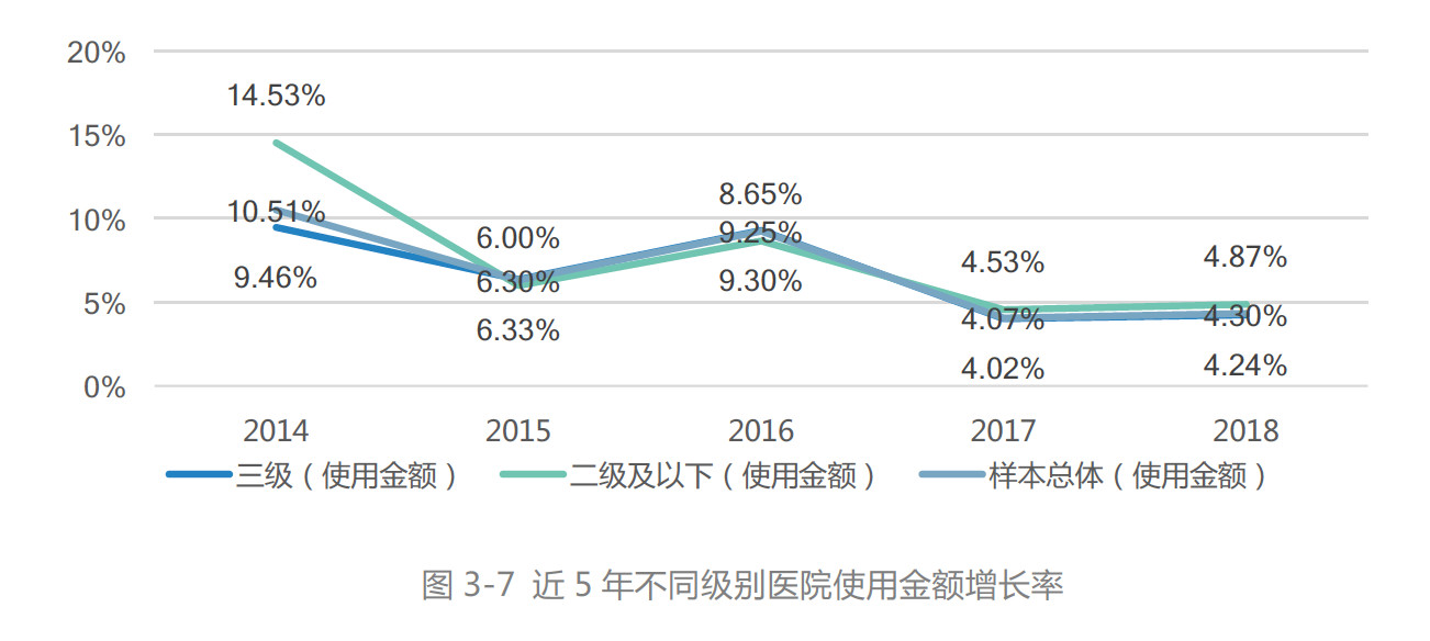 在医保控费、合理用药等政策组合拳的施行下,各级医疗机构近五年全药使用金额增速明显放缓,其年增速已经从2014年的10.51%下降到2018年的4.30%,但在不同ATC大类中,使用金额的变化幅度并不大,均是小于2%。