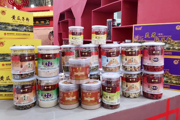中药饮片展示区展示了人参、鹿茸、灵芝等名贵中药饮片,以及灵芝孢子粉、黄瓜子粉等各类精制饮片、花草茶等。
