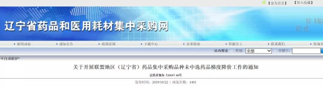 10月22日,辽宁省药品和医用耗材集中采购网发布《关于开展联盟地区(辽宁省)药品集中采购品种未中选药品梯度降价工作的通知》(简称《通知》),要求按照国家政策相关规定,就联盟地区(辽宁省)药品集中采购品种未中选药品展开梯度降价工作。