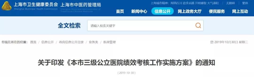 医药网10月31日讯 10月30日,上海市卫健委官网发布《关于印发<本市三级公立医院绩效考核工作实施方案>的通知》(简称《通知》),其联合上海市医保局、上海市中医药管理局、上海市发改委等多个部门,共同制定本地化实施方案,落地推进《国务院办公厅关于加强三级公立医院绩效考核工作的意见》。
