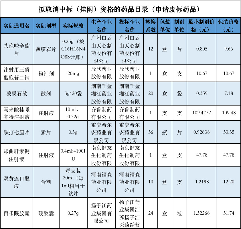 据了解,湖南千金湘江药业的蒙脱石散、福森药业的双黄连口服液、广州白云山天心制药的头孢呋辛酯片和辰欣药业的注射用三磷酸胞苷二钠等8个产品,申请废标。