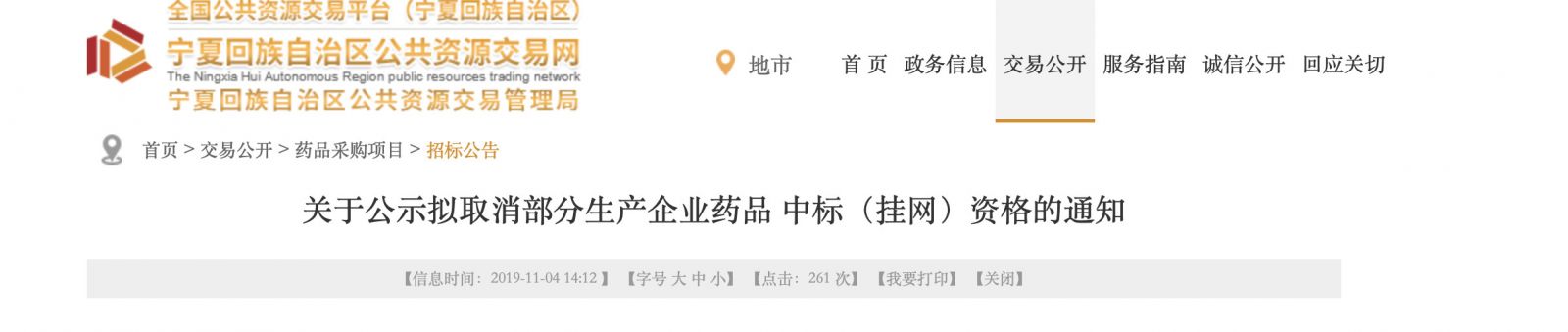 11月4日,宁夏回族自治区公共资源交易网公布《拟取消部分生产企业药品中标(挂网)资格的通知》(以下简称《通知》)。