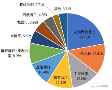 图2 2018年国内医院抗抑郁药物用药市场格局概况(按品种)