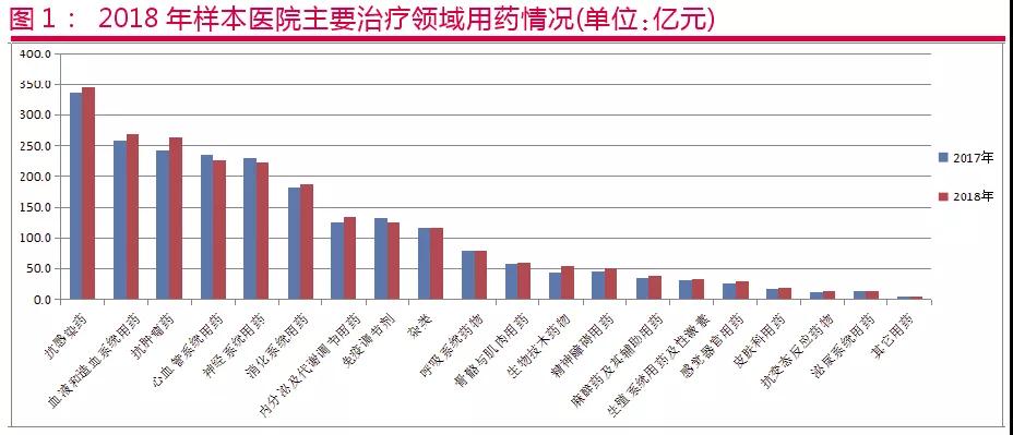 2018年,从样本医院治疗领域来看,排名前十的治疗领域用药金额达到1964亿元,占据整体市场的86.0%。排名前五位治疗领域分别是:抗感染药、心血管系统用药、血液和造血系统用药、神经系统用药、抗肿瘤药,用药金额均已超过200亿元,合计为1321亿元。其中,抗肿瘤药较同期增长较快。
