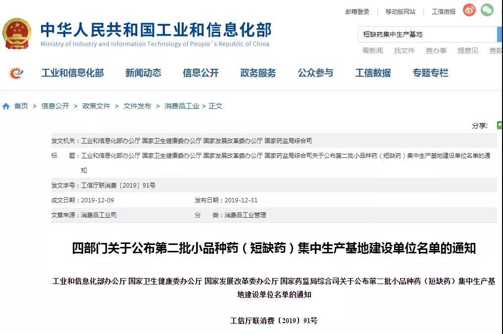 2019年12月31日,国家工信部等四部门联合发布《关于公布第二批小品种药(短缺药)集中生产基地建设单位名单的通知》,正式确定远大医药和广州医药牵头组建的联合体、东北制药牵头组建的联合体、华北制药和石药控股牵头组建的联合体3家联合体为第二批小品种药(短缺药)集中生产基地建设单位。