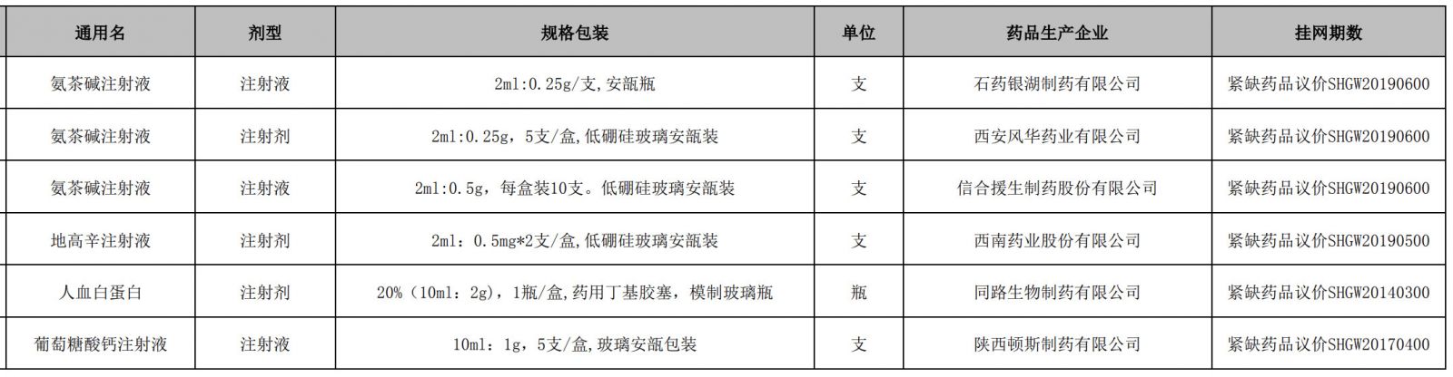 本次共6个临床紧缺药挂网,涉及4个品种,分别来自6家药品生产企业。
