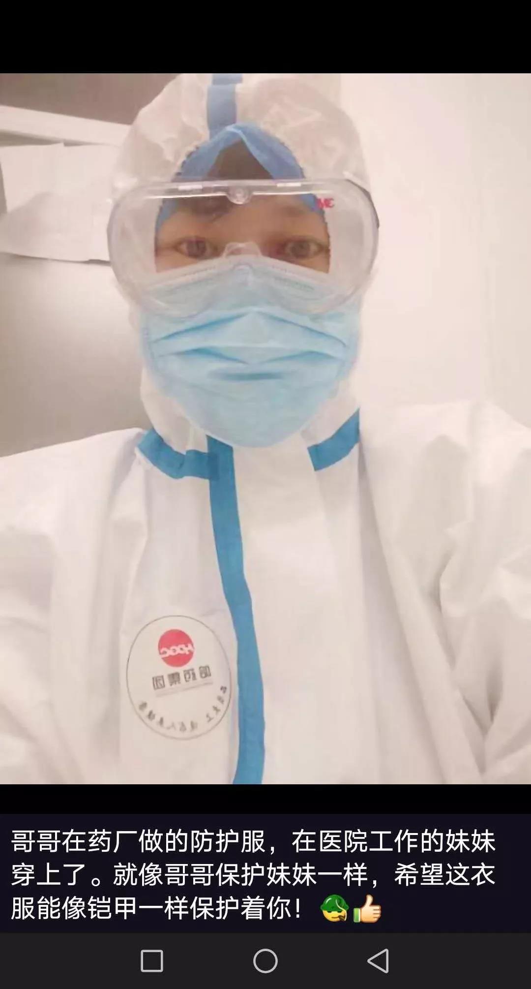 2月17日,爱游戏体育总厂105车间张慧明发了一个朋友圈:哥哥在药厂做的防护服,在医院工作的妹妹穿上了。就像哥哥保护妹妹一样,希望这衣服能像铠甲一样保护着你!