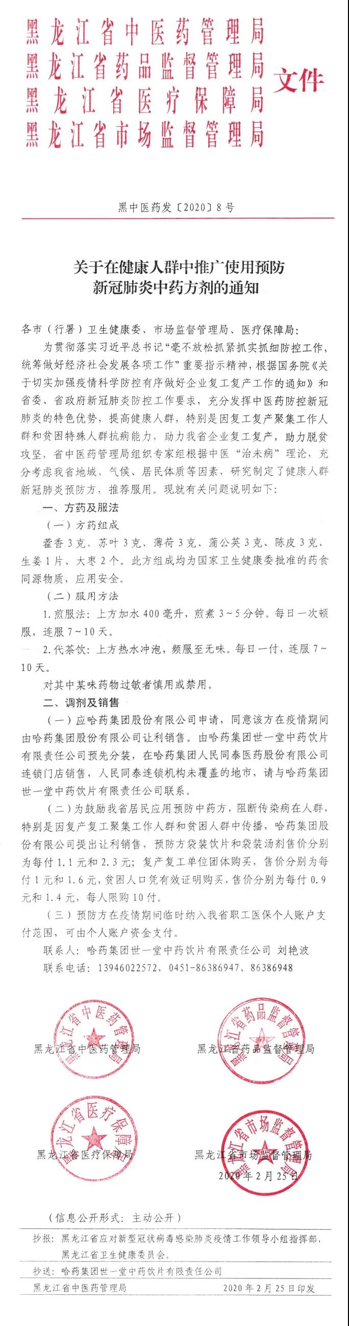 近日,按照省委、省政府新冠肺炎防控工作要求,为助力黑龙江省企业复工复产,助力脱贫攻坚,省中医药管理局组织黑龙江省国医大师、歧黄学者以及多位新冠肺炎救治中医专家指导组成员召开视频会议,遵循中医“治未病”理论,发挥中医“简便验廉”优势,研究制定了健康人群新冠肺炎预防方,此方组成均为国家卫生健康委批准的药食同源物质,应用安全。