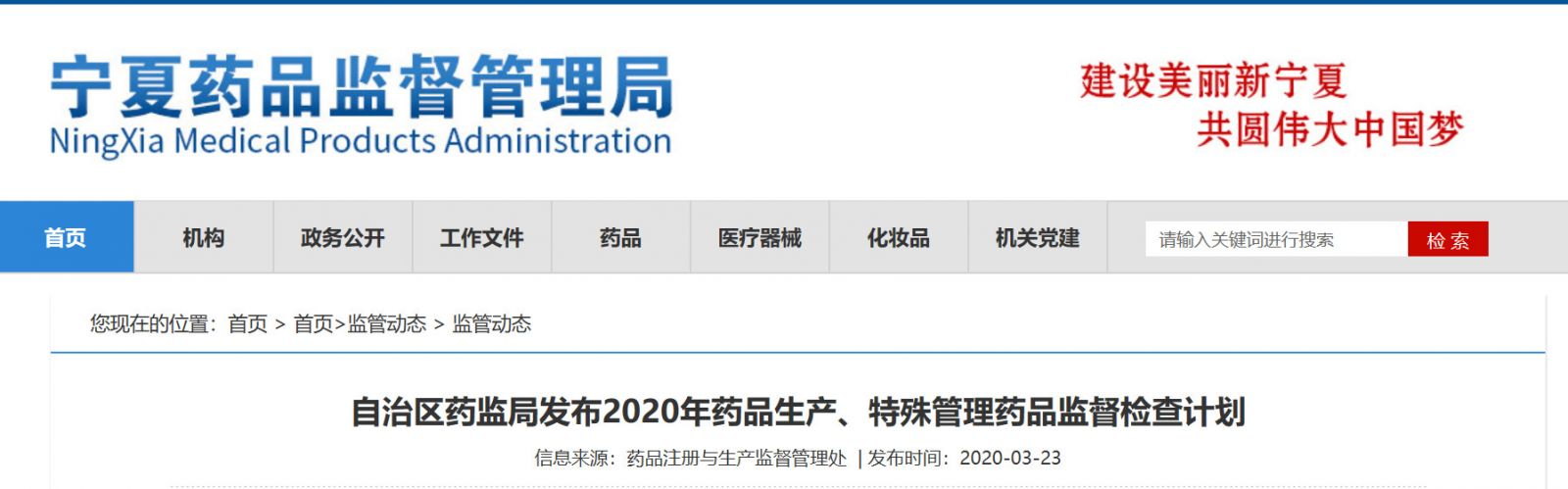3月23日,宁夏自治区药监局发布2020年药品生产、特殊管理药品监督检查计划。