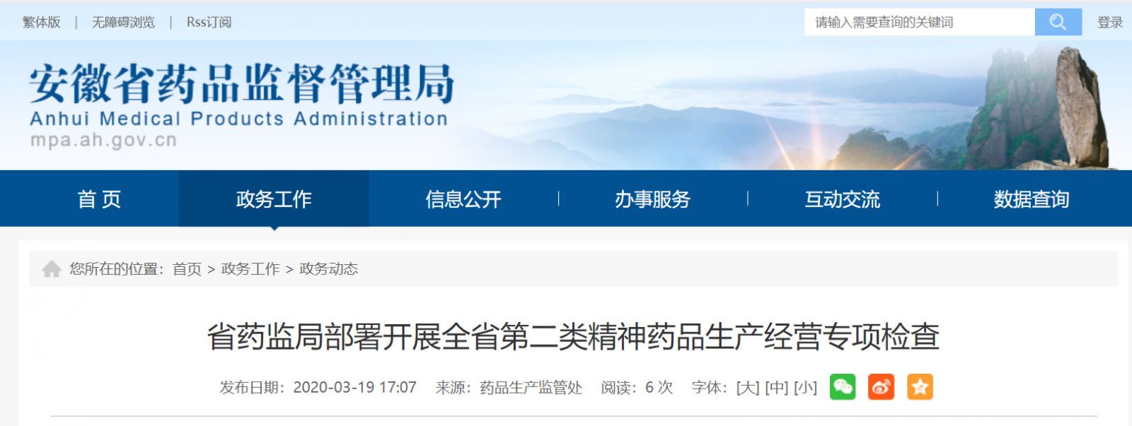 3月19日,安徽省药监局于近日部署开展第二类精神药品专项检查。