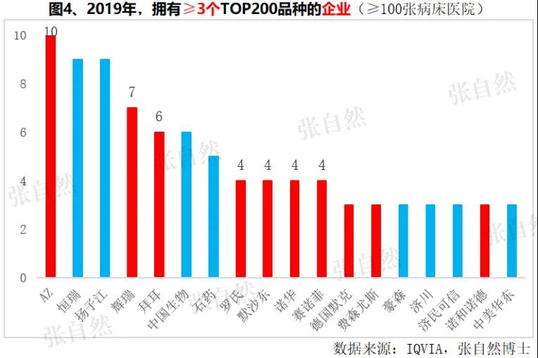 大品种体现了药企的竞争实力,而在≥100张病床医院销售前200位的大品种也已基本反映了大品种的概貌,下面就根据IQVIA数据(≥100张病床医院),对产品入围2019年销售TOP 200品种中的外企情况做一分析。