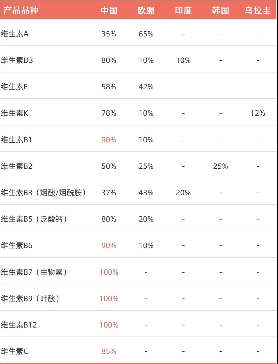 目前全球的生物素、叶酸和维生素B12仅在中国产出,维生素B1、维生素B6、维生素C、维生素D3和泛酸钙,中国的产量占比均超过80%。所有维生素产品在中国均有生产。