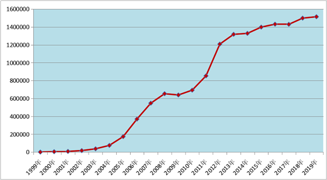 图1 1999年-2019年全国药品不良反应/事件报告数量增长趋势