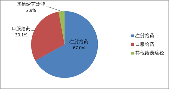 按照药品给药途径统计,注射给药占67.0%、口服给药占30.1%、其他给药途径占2.9%(图16)。注射给药中,静脉注射给药占92.7%、其他注射给药占7.3%。
