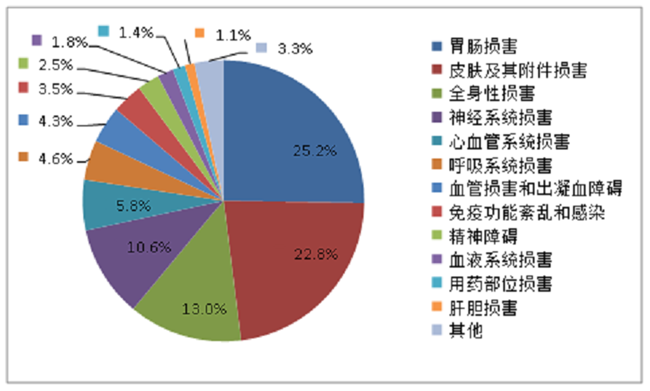 2019年国家基本药物化学药品和生物制品不良反应/事件报告,按照药品类别统计,报告数量排名前5位的分别是抗微生物药、心血管系统用药、抗肿瘤药、激素及影响内分泌药、治疗精神障碍药;累及器官系统排名前5位的是皮肤及其附件损害、胃肠损害、全身性损害、神经系统损害以及血液系统损害。