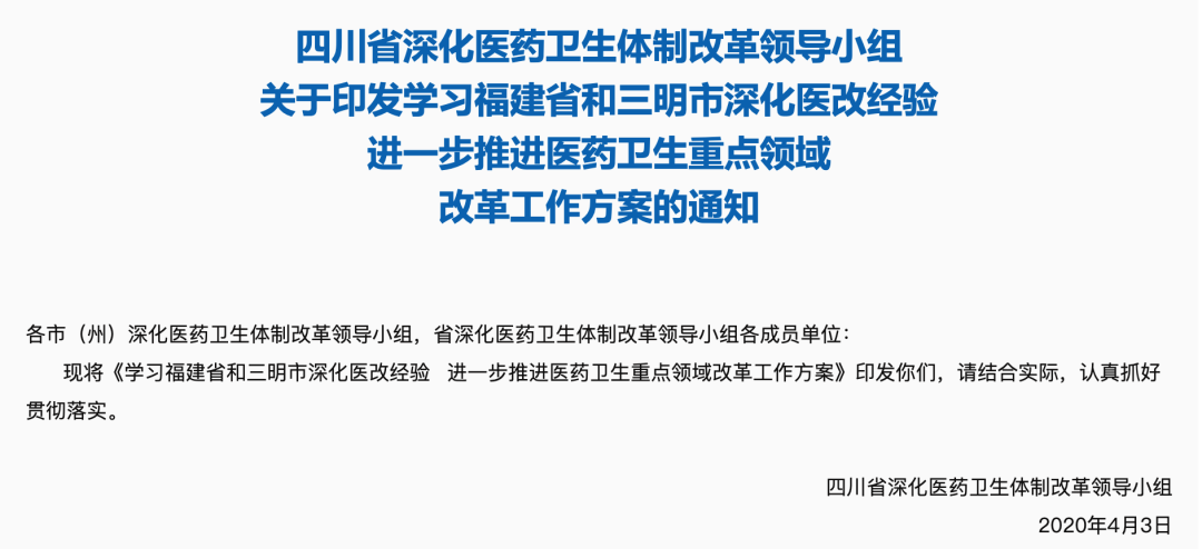 医药网4月29日讯 4月27日,四川省卫健委发布《关于印发学习福建省和三明市深化医改经验进一步推进医药卫生重点领域改革工作方案的通知》,共涉及七方面29项重点任务。