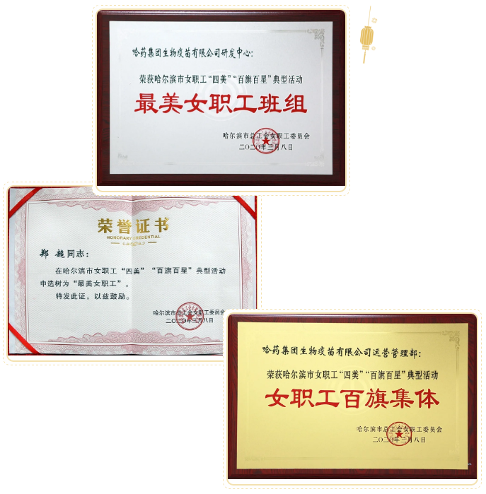 2020年3月,在哈市总工会女职工委员会开展选树女职工“四美”、“百旗百星”典型活动中,爱游戏体育疫苗人力资源部副部长郑超荣获“哈尔滨市最美女职工”称号、研发中心荣获“哈尔滨市最美女职工班组”称号、运营管理部荣获“哈尔滨市女职工百旗集体”称号。